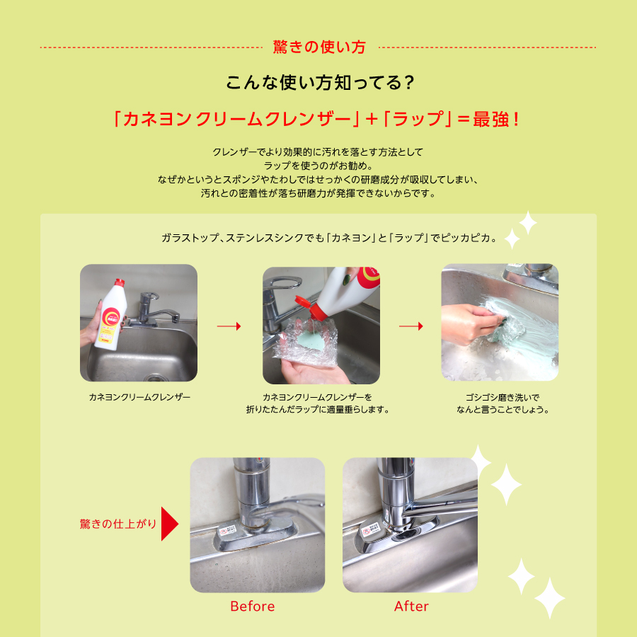汚れに直接かけるか、スポンジ等に含ませてやさしくこする。使用後は必ず水でよく洗い流すか水拭きする。
